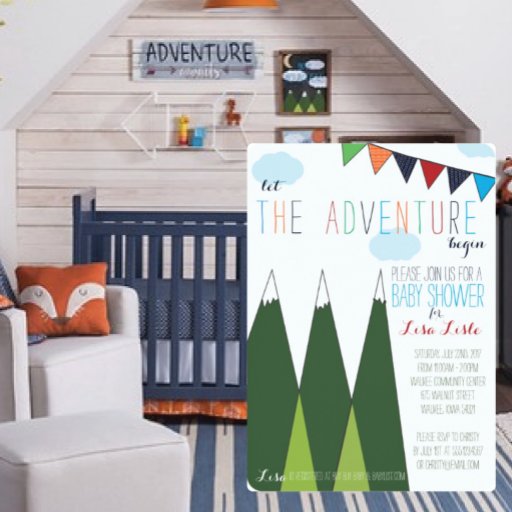 Que o Chá de fraldas Começo da Aventura tenha montanhas verdes, uma faixa colorida e nuvens azuis do céu. A parte traseira apresenta um padrão de seta laranja em negrito e um padrão geométrico do marinho. Este design foi inspirado pela Sala de Seta Laranja e Marinho do Alvo https://www.target.com/p/orange-&-navy-arrow-nursery-room/-/A-51122893
