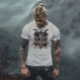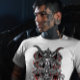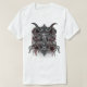 Uma camiseta de design gótico escuro com uma grande caveira de cabra com uma caveira humana em cada lado. Há um pentagrama na parte inferior e sangue pingando de toda a imagem.