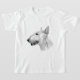 Um desenho detalhado a lápis de um Touro Terrier pelo artista Danguole Serstinskaja, mostrando sua forma distintiva de cabeça com um focinho alongado, orelhas apontadas e olhos expressivos. O desenho enfatiza a estrutura muscular do cão e o casaco suave, com sombreamento macio proporcionando profundidade e textura. O enfoque no perfil da Bull Terrier, realçando as suas características únicas e as suas características de raça.