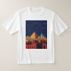 Geometric illustration of a desert landscape featuring a large pyramid surrounded by domed structures with blue roofs. The foreground includes a stylized cityscape with red and brown buildings, suggesting an urban area. The sky above is deep blue, adorned with white stars and constellation patterns, lending a celestial quality. The setting implies elements of Middle Eastern or North African architecture, possibly referencing Egypt with the presence of the pyramid. The style is simplistic, using bold shapes and contrasting colors.