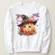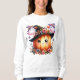 Abóbora-cabra charmosa de kawaii, com um chapéu de bruxa, rodeada por fantasmas brincalhões e flores vibrantes para roupa festivo e confortável. Perfeito para as comemorações do outono e diversão do Halloween.