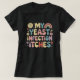 Um design brilhante e humorístico com a frase "Minha Infecção de Leveduras" em letras coloridas de bolhas. Ao redor do texto estão flores animadas de desenho animado com rostos sorridentes, arco-íris pastel e estrelas quentes, todas colocadas sobre um fundo preto. Esta design única e divertida combina humor leve com uma estética retrorreflectora vibrante, perfeita para aqueles que amam declarações peculiares e ousadas.