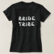Uma clássica camiseta preta com tribo da noiva em branco na frente. A parte de trás apresenta mais texto personalizável. Para alterar o nome ou excluir, clique no botão personalizar.