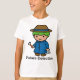 Garoto bonito de chapéu e casaco azul com pincel de impressão digital e um saco de provas. Para o futuro detetive, cientista forense, ou detetive privado. Personalize o texto.