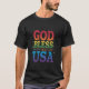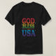Esta design de camiseta patriótica apresenta o texto "Deus abençoe os EUA" em um vibrante esquema multicolorido. Cada palavra é uma cor clara diferente, criando um design ousado e atraente.