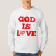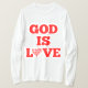 Esta manga longa apresenta uma impressão com cinco letras vermelhas mostrando o ditado bíblico "Deus é o amor" com o O do amor substituído por uma coleção da palavra Amor feito em um coração neste tema bíblico de citação. Essa camiseta comprida é confortável, casual e flexível, feita de 6,0 oz, algodão pré-encolhido 100%, com agulha dupla coalhada em baixo e mangas para durabilidade extra tem uma imagem correspondente menor na parte de trás de nossa ajustado camisetas e veste bem em qualquer um e em todos.