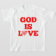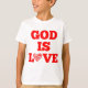 Esta camiseta de meninos apresenta um pedaço de cinco impressão com letras vermelhas mostrando o ditado bíblico "Deus é amor" com o O in Love feito substituído por uma coleção da palavra Amor feito em um coração neste tema bíblico de citação. Esta árvore é confortável, casual e solta, feita a partir de 100% de algodão, com pernas de agulha dupla coçadas e capas de manga para maior durabilidade nossa ajustado camisetas e veste bem em todos.