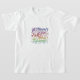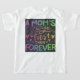 Esta design de camiseta celebra o poder duradouro do amor de uma mãe. A mensagem "Uma Mãe ama você primeiro e depois para sempre" é exibida em um vibrante esquema multicolorido, com cada palavra potencialmente uma cor diferente. Não há imagens de pessoas na camisa, deixando o texto que está armando o coração levar o palco central.