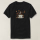 Uma xícara de café e um pires de cor creme cheios de café que parecem transbordar e ligeiramente dispersos, criando um senso de movimento ou um derramar de café.