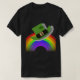A camisa preta deste homem apresenta um Rainbow e Leprechauns Hat colorido sobre um fundo verde esmagador. Perfeito para as festas do dia de Patrick da Rua