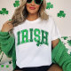 Esta Rua divertida. A camiseta do Dia de Patrick mostra a palavra 'IRISH' em uma fonte retrorada curvada em cores verdes claras e escuras com uma pedra de champanhe coordenadora.