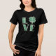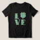 Love Dia de São Patrício Green Xadrez Shamrock T-shirt apresenta o texto "Love" na tipografia moderna verde e xadrez branca, acentuada com uma shamrock. Perfeito para o Dia do Paddy Santo.