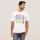 Este design apresenta uma camiseta branca com a palavra "FIELD" em uma fonte vermelha estilizada acima da palavra "Dia" em azul. Abaixo de "Dia" está o ano "2025" a verde. A design inclui um gráfico de uma caneta azul e um livro pequeno