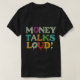 A t-shirt apresenta a frase "Money Talks Loud" numa letra de banda desenhada corajosa e multicolor. Um gráfico de sinal de dólar pop espertamente do "O" em "Talks", adicionando um toque lúdico ao design.
