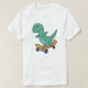 Dinossauro caprichoso andando de skate, cores vibrantes e estilo divertido ideal para jovens e roupas casuais, misturando aventura com originalidade brincalhona.