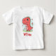 Esta camiseta personalizada de criança apresenta um doce dinossauro vermelho para bebês com grandes olhos e um sorriso amigável, rodeado alegremente por flores e borboletas.