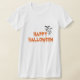 Esta camiseta suave das mulheres feita por Bella Canvas é mostrada em branco com um texto de Dia das Bruxas Feliz com impressão de morcegos. Personalize este item ou comprar como está.