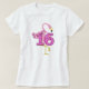 Doce, camisa de aniversário de 16 anos. O número 16 em brilho rosa. Este é um efeito impresso e não uma falha real. Atrás está um flamingo rosa bonito.