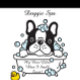 Uma ilustração cartoon apresenta um cão preto e branco, possivelmente um Boston Terrier ou um Bulldog Francês, sentado numa banheira cheia de bolhas. O cachorro tem uma cabeça preta com marcas brancas no rosto e no peito, e suas orelhas são pretas. A banheira é branca com contornos pretos e cheia de bolhas azuis-claras. Um pato de borracha amarelo é visível perto do canto inferior esquerdo da imagem. Acima do cão, as palavras "Doggie Spa" são escritas em letra decorativa. Abaixo da banheira, o texto "Meu chefe gosta quando eu cheiro doce!" é exibido em uma fonte semelhante. A ilustração é simples e limpa, com contornos em negrito e uma paleta de cores limitada.