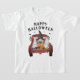 Aproveite a estação assustadora de Halloween com esta camiseta legal de Halloween. Apresenta uma legal ilustração aquática de um caminhão-reboque vermelho-vintage com três gnomos no leito do caminhão junto com uma abóbora, um jack-o-lanterna e um gato preto. Bates voadores completam esta divertida cena do Dia das Bruxas. Acima dela está a citação sazonal Feliz Halloween na tipografia negra.