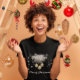 Camiseta de Natal festiva para as suas alegres férias de Natal. Belas bolas de Natal de ouro e pinheiro prateado cercado por flocos de neve brancos em fundo preto dão-lhe uma aparência festiva. presente de Natal perfeito para sua família e amigos.