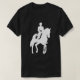 Design preto e branco elegante com uma silhueta de cavalo e cavaleiro numa pose de vestido. Perfeito para quem ama esportes equestres.