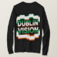 DUBLIN sobre comandos VISION centraliza em letras maiúsculas pesadas, definido em uma placa branca irregular em bloco de pixel. Verde com deslocamentos laranja fratura e ecoa as letras com vibrações VHS glitchy, enquanto listras e barras finas irradiam para fora contra um impacto negro ousado.