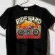 Aqui está outro design de camiseta tradicional com uma paisagem retrorativa com um fundo de explosão solar e a frase "DURO RIDE". Avise-me se você quiser mudanças! ✨