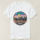 Um legal design do estilo vintage para caminhar amantes com uma paisagem de montanha, que diz: E então a aventura começa.
