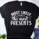 A temporada de férias está se aproximando rapidamente e é hora de começar a preparar sua lista de comprados. Você tem pensado sobre presentes de Natal por um tempo, mas o problema é que você não sabe o que comprar. Se você precisa de algumas ideias, você deveria começar a olhar para as camisas da família de Natal. Estas camisas são perfeitas para toda a família e são perfeitas para dar a todos na sua lista. São baratos e seriam um presente perfeito para todas as idades. A camisa diz que é mais provável que consiga os presentes. Faz um presente generoso para familiares e amigos. Excelente para fotos e na manhã de Natal e também uma festa engraçada com camisa.
