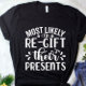 A temporada de férias está se aproximando rapidamente e é hora de começar a preparar sua lista de comprados. Você tem pensado sobre presentes de Natal por um tempo, mas o problema é que você não sabe o que comprar. Se você precisa de algumas ideias, você deveria começar a olhar para as camisas da família de Natal. Estas camisas são perfeitas para toda a família e são perfeitas para dar a todos na sua lista. São baratos e seriam um presente perfeito para todas as idades. A camisa diz que é muito provável que os presentes de Natal sejam representes. Faz um presente generoso para familiares e amigos. Excelente para fotos e na manhã de Natal e também uma festa engraçada com camisa.