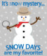 Dia da Neve! Há recordações especiais de ouvir o rádio num dia de tempestade de inverno na esperança de ouvir o nosso sistema escolar entre a lista de encerramentos. Quando finalmente foi anunciado, uma alegria feliz tocou pela casa enquanto todos nós passávamos para a cama para aproveitar um feriado inesperado. Meus próprios filhos tiveram experiências semelhantes. Ser fã de filmes misteriosos foi a inspiração de adicionar algum personagem a esse boneco de neve junto com uma peça sobre palavras.