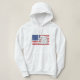 Águia majestosa voando orgulhosamente ao lado da bandeira nacional americana.