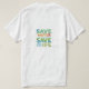 O design de camiseta ocular traz a mensagem "Save Water, Save Life" (Economize água, salve a vida) em um vibrante esquema de multicores. Cada palavra é uma cor diferente, criando um visual dinâmico e lúdico. O design evita qualquer imagem do pessoas, focando-se apenas na mensagem impactante em uma combinação de cores cativante.