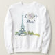 Esta camisola clássica apresenta uma caneta de aquarela romântica e desenho de tinta da Torre Eiffel. o texto lê "amor Paris!" com um biscoito em forma de coração que está em pé para o 'o' em 'amor'. Copyright Leah Wiedemer