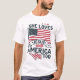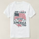 Esta design apresenta uma camiseta branca com o texto "SHE LOVES" acima de uma imagem da bandeira americana. Abaixo da bandeira, aparece o texto "JESUS E AMÉRICA TAMBÉM".