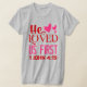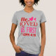 "Ele nos amava primeiro" (1 John 4:19). Texto vermelho e cor-de-rosa adornado com corações. Escolha sua cor e estilo de camisa favoritos para torná-la sua.