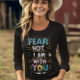 Um poster com as palavras não teme, eu estou com você em uma fonte ousada e tranquilizadora. As palavras estão rodeadas de cores pastéis suaves e designs florais delicados, criando um sentimento de paz e segurança.