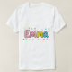 O nome "Emma" aparece coloridamente com cada letra em uma matiz diferente, cercada por pequenos símbolos como estrelas e corações. Um design alegre adiciona um elemento alegre contra um fundo castanho escuro.