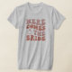 Camiseta cinza engraçada e fofa de solteira para a noiva. Texto simples que diz Aqui vem a noiva com letras cor-de-rosa e um anel cor-de-rosa.