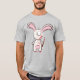 Coelho engraçado e assustador com olhos loucos e segurando uma faca com sangue.