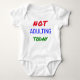"NÃO ADULTAR HOJE" é o texto humorístico sobre este vestuário para bebês. Tem cores vermelho, azul e verde brilhantes, e um rosto rabiscado no 'O' de NOT.