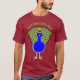 Esta camisa apresenta um brilhante e ousado Peacock de Natal vestindo um chapéu de Papai Noel. O pássaro tem uma barriga azul brilhante com uma bela coleção de penas guardadas orgulhosamente atrás. Os pontos de vista são azuis, castanhos e verdes. O Pavão tem grandes olhos pretos e um belo bico de cinzas.