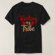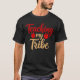 Esta imagem apresenta uma t-shirt preta com o texto "Ensinar" escrito num script vermelho a correr no topo. Abaixo, "my" está em uma fonte menor, vermelha, sans-serif, flanqueada por duas ilustrações de maçã vermelha. A palavra "Tribo" está no fundo de um script maior, de cor castanha e ligeiramente curvo.