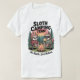 Esta roupa branca exibe uma cena de acampamento com duas preguiças de desenho relaxando em cadeiras dobradas por uma fogueira. Uma preguiça veste um gorro, e os outros óculos de sol. O texto diz "Equipe de acampamento SLOTH" acima e "Sem Hustle, Apenas Natureza" abaixo. É uma design divertida para aqueles que gostam de acampar e de um ritmo relaxado.
