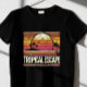 Aqui está outro design de camiseta tradicional com uma paisagem retrorativa com um fundo de explosão solar e a frase "ESCAPE TROPICAL". Avise-me se você quiser mudanças! 🌄 ✨
