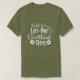 Esta camiseta verde-oliva apresenta o texto "Espera!! Deixem-me pensar demais nisso" em uma fonte branca divertida. A palavra "Pensamento excessivo" é enfatizada com estrelas e pontos de exclamação, e a palavra "ISTO" é flanqueada por designs florais. A design reconhece com humor a tendência de se sobreanalisar as coisas.