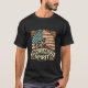 Aqui está outra design de camiseta tipo vintage rústica apresentando um lobo solitário parado em um pico rochoso com um pano de fundo de bandeira Americana envelhecido e a frase "Espírito sem dominação" 🐺 🇺 🇸 ✨