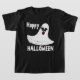 Fantasma branco com olhos vermelhos e boca e preto. Um raio de cinza preta por olho. Feliz Dia das Bruxas está escrito em legal letra branca. Design de Arte Original por TamiraZDesign.
