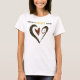 Qualquer mulher do Exército adoraria esta camisa que apresenta uma moderna espiral cardíaca, design de cima aberto, com uma dentro de imagem cardíaca menor. Ambas as imagens estão cheias de estrelas douradas sobre fundo preto e vermelho. Acima das imagens cardíacas, encontra-se o texto preto e dourado "PROUD ARMY WIFE".